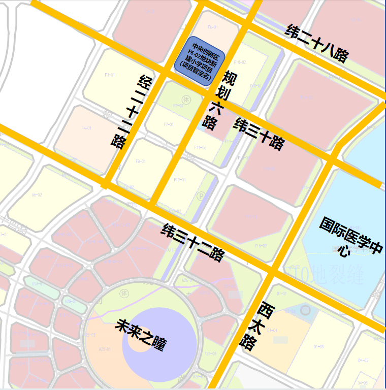 中央创新区F6-02地块新建小学项目(项目暂定名)位于经二十二路以东,纬二十八路以南,纬三十路以北,规划六路以西,规划为一所48班完全小学,建设内容包括教学楼、综合楼、运动场等。