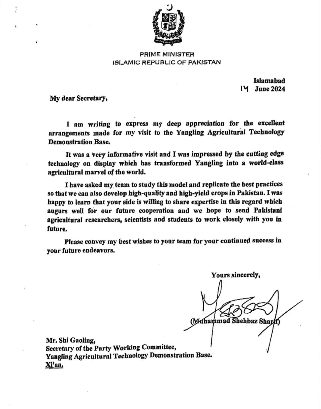 日前,巴基斯坦伊斯兰共和国总理穆罕默德•夏巴兹•谢里夫向杨凌示范区党工委书记史高领特致感谢信,对其在杨凌访问期间所作的精心周到安排表示感谢,尤其是对杨凌现代农业科技印象深刻,希望未来能派遣巴基斯坦的农业研究员、科学家及学生与杨凌开展密切合作。感谢信全文内容如下: