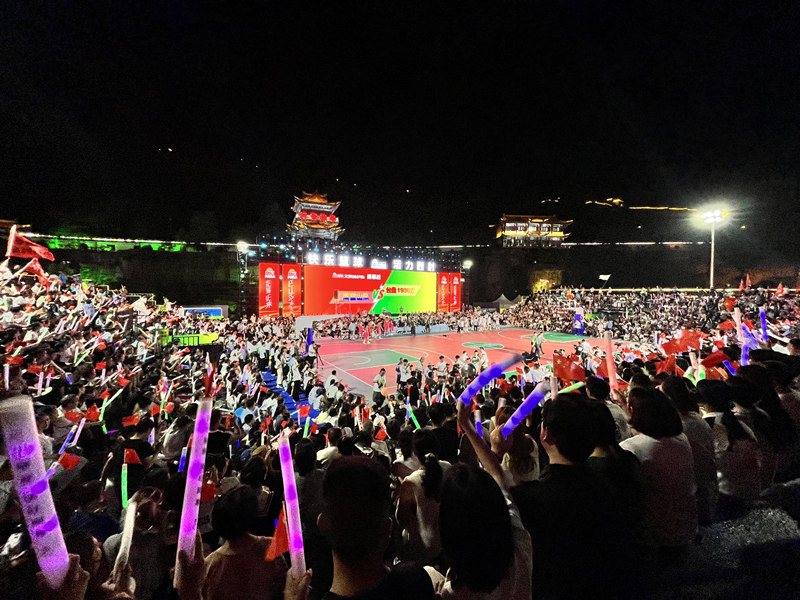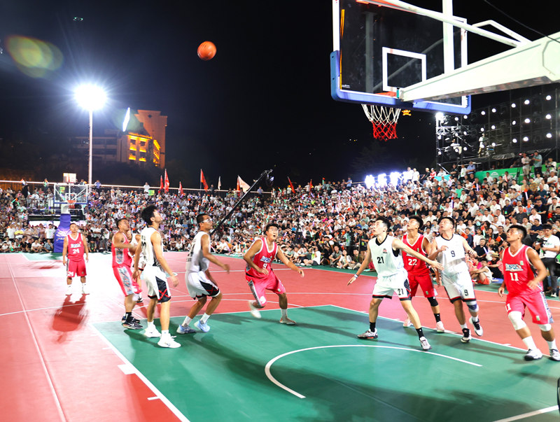 首场比赛由岚皋县南宫山代表队和台江县台盘1936代表队拉开战幕。各队以比赛为契机,切磋球技,以球会友。球员们每一次精彩的快攻、精准投篮、强力盖帽,观众都会爆发热烈的欢呼和掌声。球赛、球迷,灯光、演出,山峦、河流,还有岚皋人民的热情,构成了一幅和美欢乐的画面。