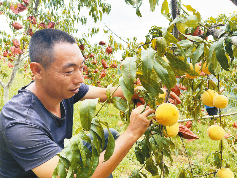 近日,略阳县乐素河镇徐家坝村的黄桃迎来采摘期,一个个金黄的果实缀满枝头,果农侯全斌脸上满是喜悦。