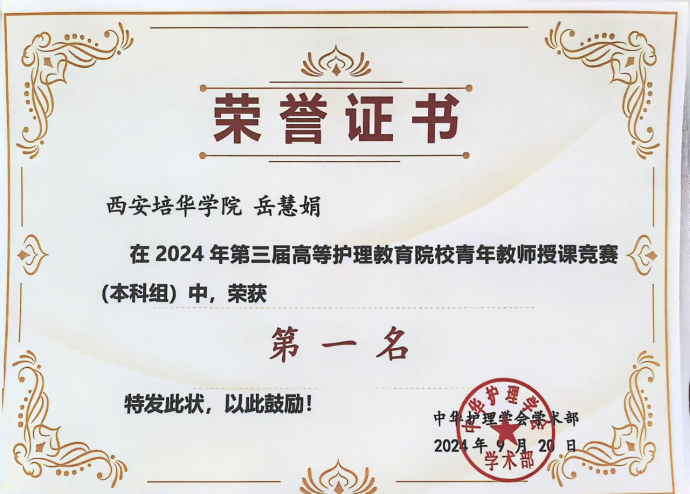 西安培华学院医学院护理系岳慧娟副教授作为2021年陕西省青年护理教师教学大赛一等奖获得者,与省内其他5所本科院校的5位老师被陕西省护理学会选送参加此次比赛。最终,岳慧娟老师以卓越表现,力压群雄,荣获本科组第一名,成为陕西省唯一一位荣获此殊荣的选手。