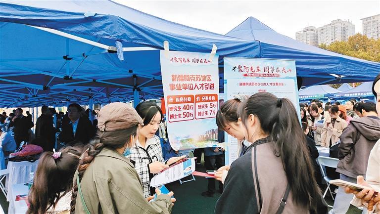 活动现场,新疆阿克苏地区也前来宣介,向毕业生们深入讲解最新的地区人才政策,吸引了不少毕业生驻足聆听。 “我们此次来到西安,带来了我们当地最新的人才政策,可以说是带着满满的诚意和满满的信心。希望优秀学子们能够前来深入了解,更期盼他们能够走进阿克苏,扎根美丽的阿克苏,在那里将自己所学的专业知识用在医学一线,把论文写在祖国大地上。”阿克苏地区人社局相关负责人张叶来告诉记者,同时,阿克苏地区常态推进百名硕博社会实践活动,“在此也向西安高校的优秀学子发出邀请,欢迎大家前来开展暑期实践实习。”张叶来说。