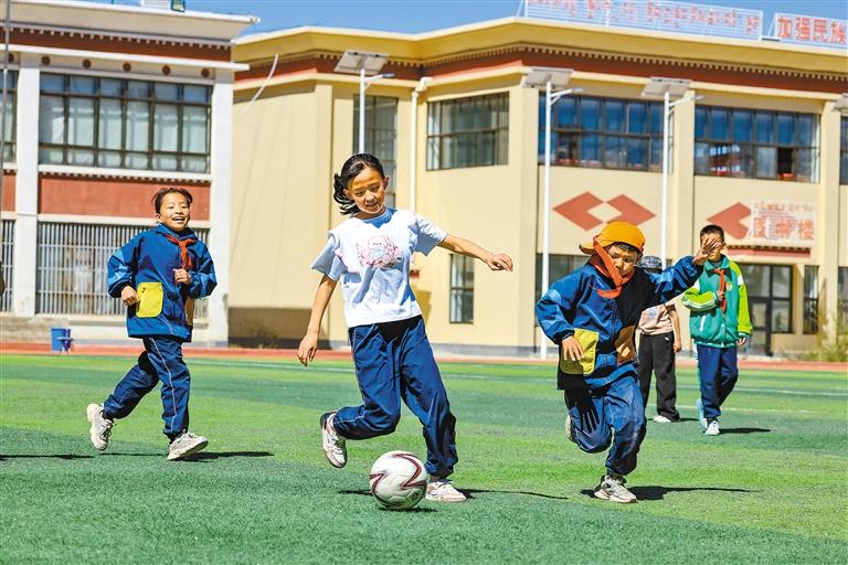 阿里地区札达县九年一贯制学校学生在进行足球比赛。