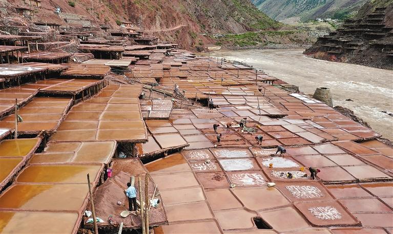 昌都市芒康县纳西民族乡加达村村民在盐田中劳作。