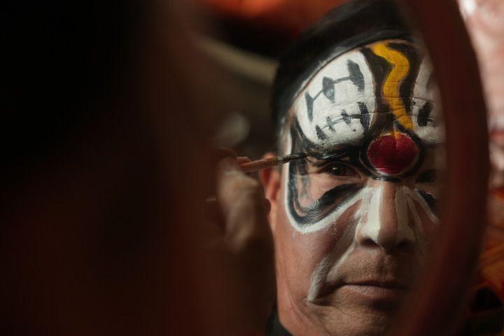 2025年1月1日,宁夏中卫市海原县三河镇红城村秉宏文化大院上演秦腔大戏,一名演员在后台化妆。新华社记者 邹欣媛 摄。