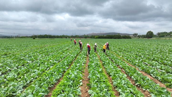 在宁夏固原市彭阳县新集乡姚河村蔬菜种植基地,村民正在施肥、锄草。(固原市委宣传部供图)