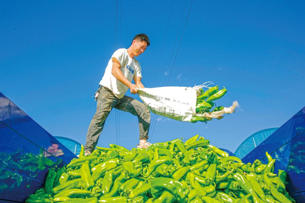 宁夏固原市隆德县沙塘镇十八里村村民在采收辣椒。(隆德县委宣传部供图)