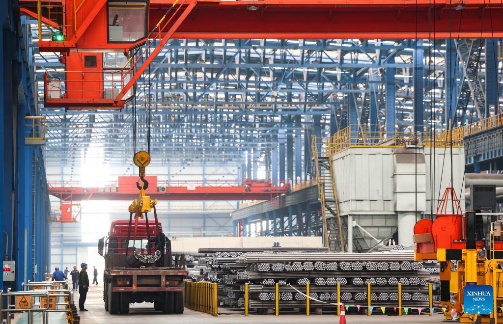 Workers of HBIS Group Shijiazhuang Iron and Steel Co., Ltd. hoist steel for transport in Shijiazhuang, north China's Hebei Province, Jan. 2, 2025. Enterprises across China are operating at full capacity to meet production demands at the start of the new year. (Photo by Liang Zidong/Xinhua)