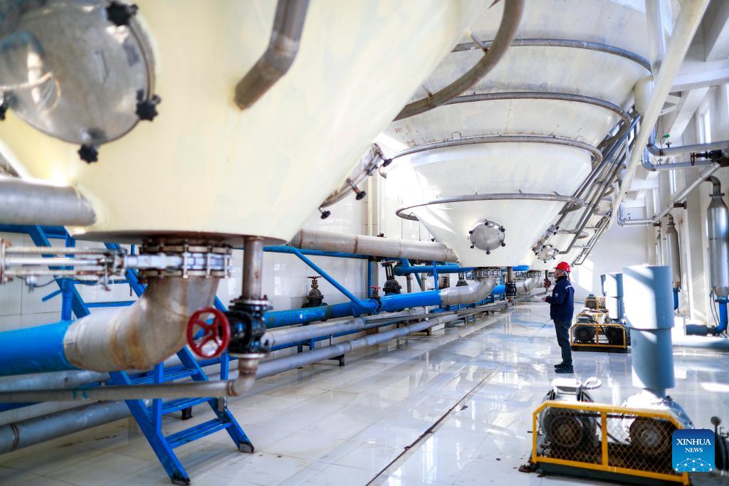 An employee works at a production workshop of Jiangsu Xinlei Malt Co., Ltd. in Xinghua City, east China's Jiangsu Province, Jan. 3, 2025. Enterprises across China are operating at full capacity to meet production demands at the start of the new year. (Photo by Zhou Shegen/Xinhua)