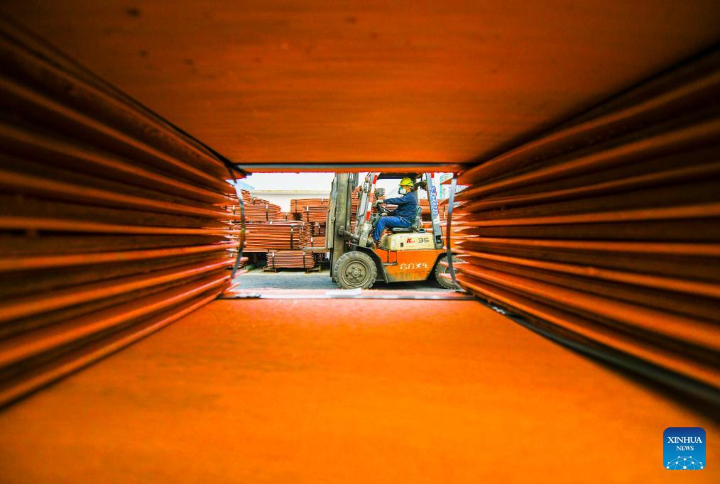 A worker drives a forklift to transfer cathode copper at a Hunan branch of China Minmetals in Changning City, central China's Hunan Province, Jan. 2, 2025. Enterprises across China are operating at full capacity to meet production demands at the start of the new year. (Photo by Zhou Xiuyuchun/Xinhua)