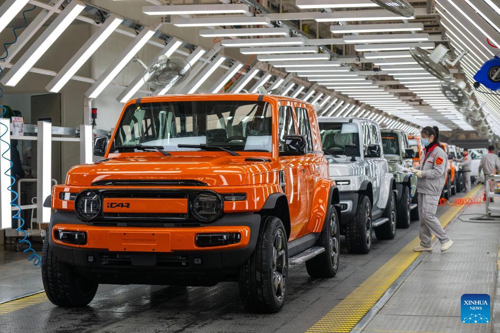 Employees work on a production line at a new energy vehicle enterprise in Wuhu, east China's Anhui Province, Jan. 3, 2025. Enterprises across China are operating at full capacity to meet production demands at the start of the new year. (Photo by Xiao Benxiang/Xinhua)