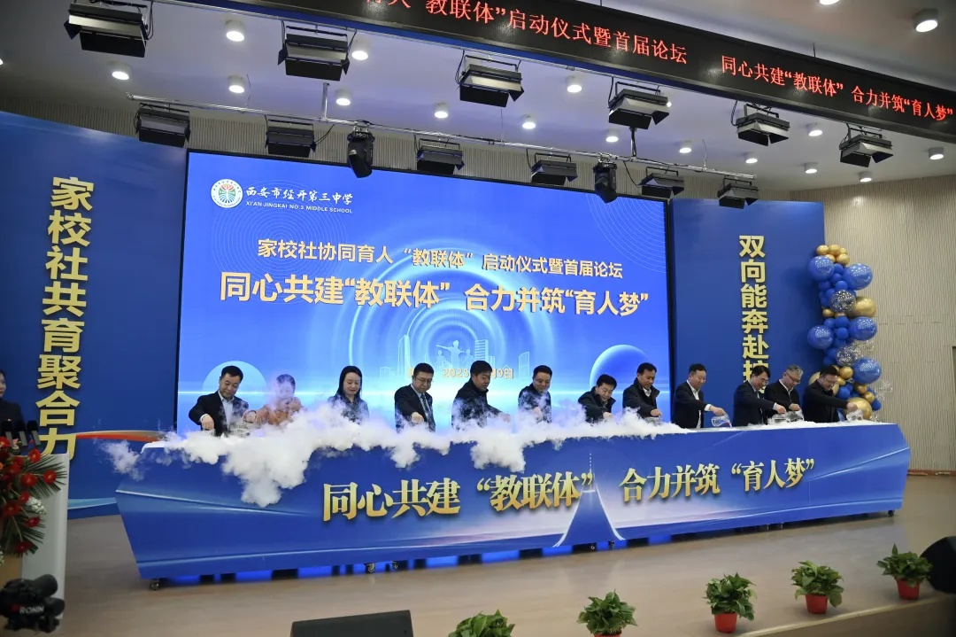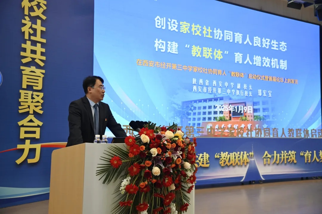 泾渭之畔,学府璀璨。1月9日下午,西安市经开第三中学(以下简称“经开三中”)举办了家校社协同育人“教联体”启动仪式暨首届论坛。此次活动旨在汇聚学校、家庭和社会三方力量,共同构筑育人新生态,助力学生全面发展。活动现场,来自陕西省科协、西安市教育局、经开区教育体育局等单位的相关代表,以及企业代表、家长代表共计450余人齐聚一堂,共襄盛举。