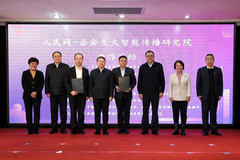 在签约环节,人民网与西安交通大学签订“人民网——西安交大智能传播研究院”合作协议。
