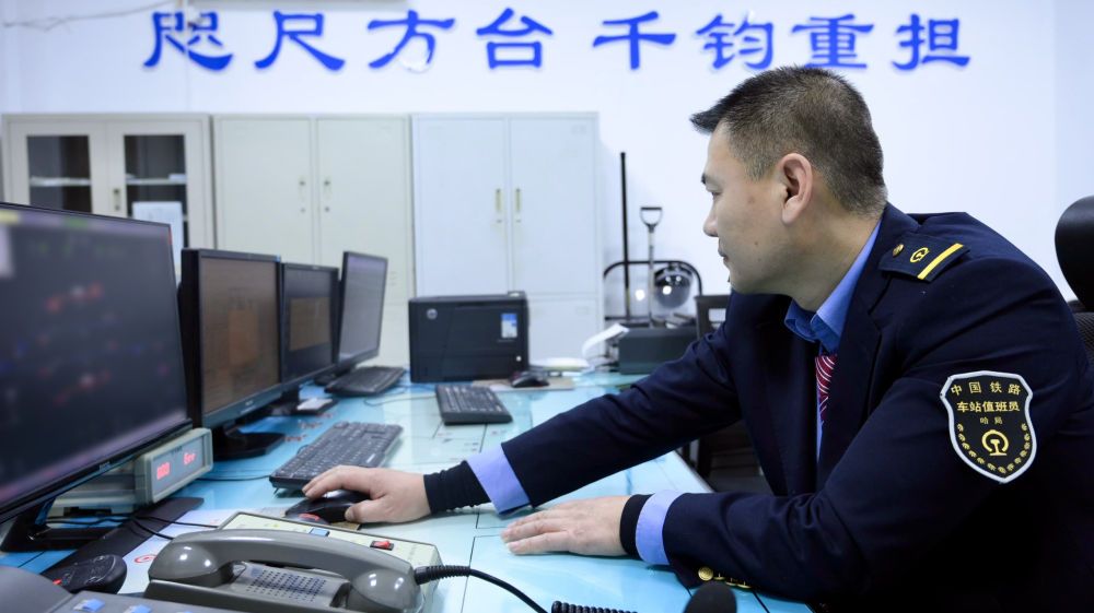 一间不大的值班室,除了床就是操作台,“咫尺方台 千钧重担”的条幅下,田春紧盯显示屏。他负责运输组织调度,是车站“最重要”的岗位。