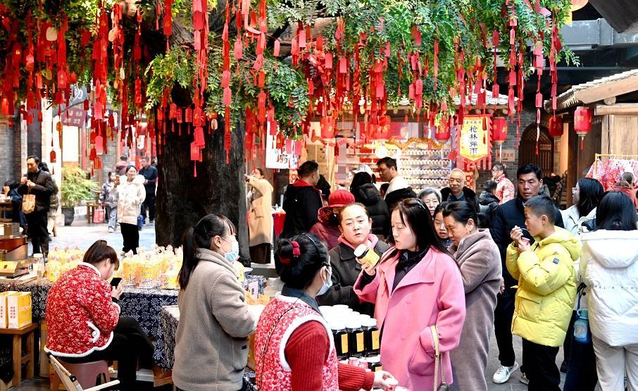 1月31日,游客在延安1938街区赏非遗、品美食,欢欢喜喜过大年。 通讯员 王德荣摄
