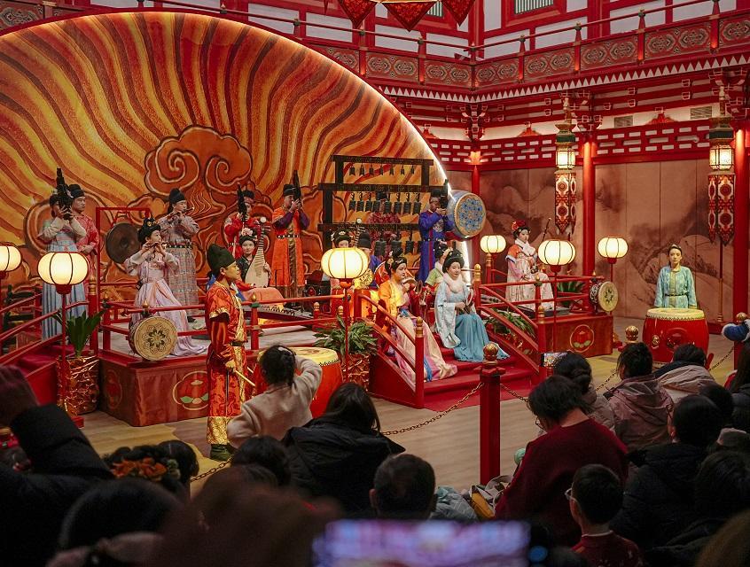 1月29日,游客在长安十二时辰主题街区观看表演。 记者 蒲茜摄