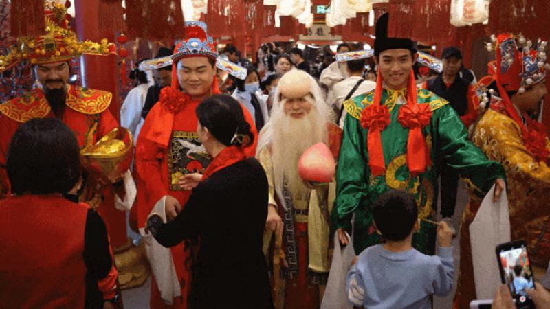 1月29日,游客在长安十二时辰主题街区“月老”“财神”互动。