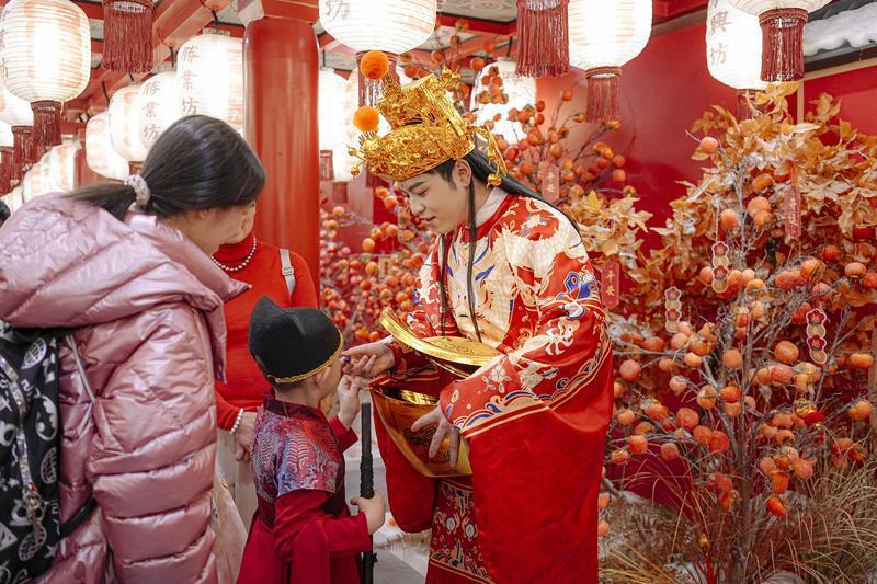 “这里年味太浓了,孩子玩得特别开心,尤其是和‘仕女蛇’拍照,都舍不得走。”来自安徽的张萌说,“一进来就像穿越回唐朝过年,太有氛围感了。”