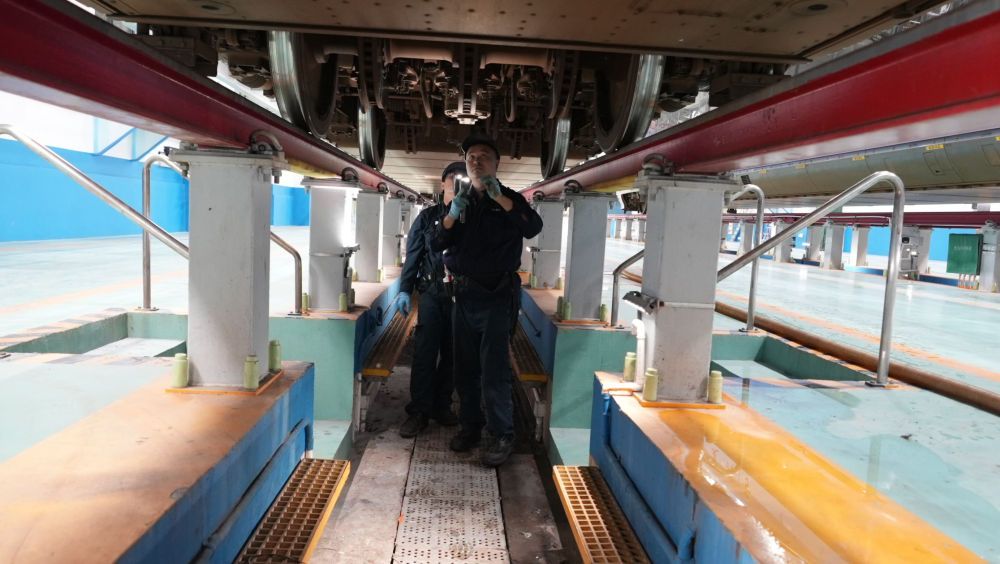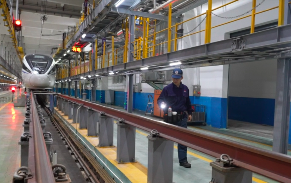 动车组入库前,地勤人员对检修库轨道进行检查。新华社记者 陈凯姿 摄