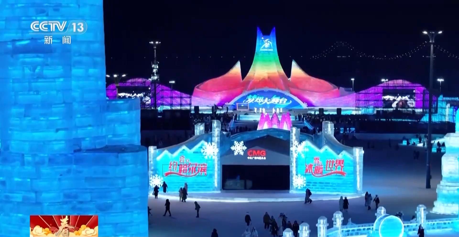 总台记者 任秋宇:欢迎大家来到第二十六届哈尔滨冰雪大世界,当夜幕降临,灯光点亮,整个冰雪大世界变得是如梦如幻,很多人来到这里会看到这八个大字“冰雪同梦,亚洲同心”,这是哈尔滨2025年第九届亚冬会的主题口号,同样也是今年哈尔滨冰雪大世界的设计主题。