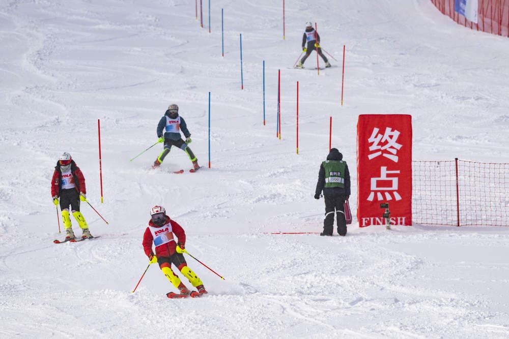 2024年12月22日,参赛选手在观察男子回转测试赛线路。当日,2025年哈尔滨亚洲冬季运动会高山滑雪项目测试赛在黑龙江省亚布力体育训练基地(亚布力滑雪场)举行。
