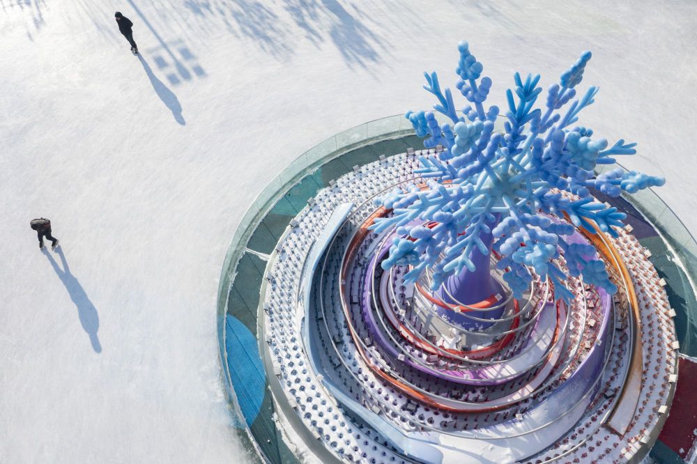 2025年1月4日,在哈尔滨市南岗区一处公益冰场,人们在“冰雪之冠”雕塑旁滑冰。