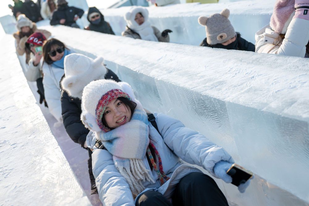 2024年12月21日,游客在哈尔滨冰雪大世界园区内玩滑梯。