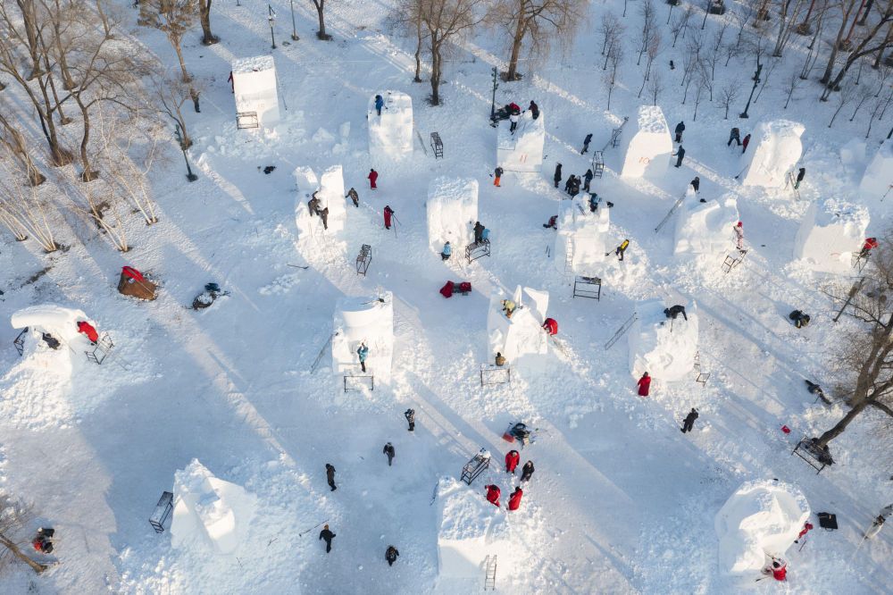 2025年1月6日,第27届哈尔滨国际雪雕比赛参赛选手在雕刻雪雕作品。来自10个国家20余支代表队的雪雕艺术家在哈尔滨太阳岛雪博会园区同场竞技。