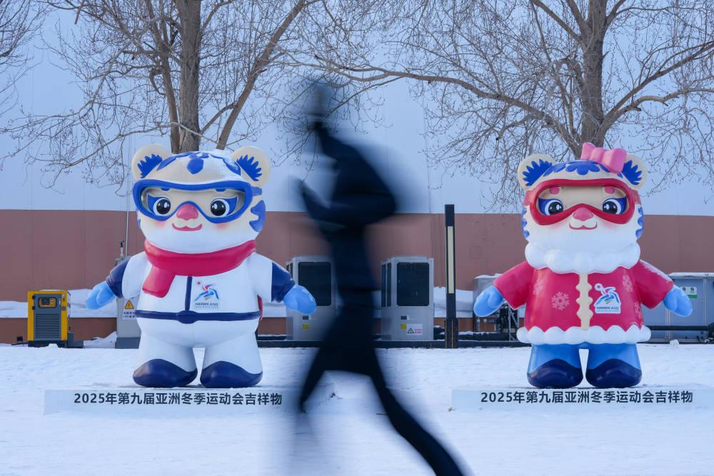 2025年1月8日,在哈尔滨湘江公园,跑步的市民从亚冬会吉祥物雕塑前经过。