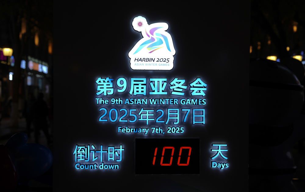 这是2024年10月30日在哈尔滨中央大街上拍摄的亚冬会倒计时牌。当日是2025年第九届亚洲冬季运动会倒计时100天。
