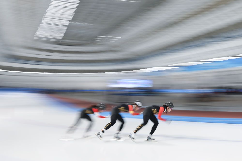 2024年12月15日,黑龙江省冰上训练中心二队选手在比赛中。当日,2024-2025赛季中国杯速度滑冰精英联赛第四站暨亚冬会测试赛女子团体追逐比赛在黑龙江省冰上训练中心举行。