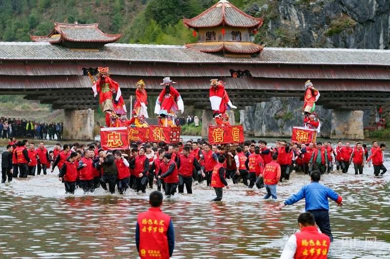 张世炎:所谓的“走古事”,就是大家抬着七个棚,也就是扮演古事的轿台,上面会站着戏曲装扮、画着脸谱的天官、武将等,不但要在岸上狂奔竞速,更需在清岩河水中逆流争渡,通过在水陆间奋勇争先,展现先祖奋勇拼搏、力争上游的创业精神,教育、激励后人。这项活动也是中华体育文化优秀节庆项目,传承至今已经二十八代了,大家抬起古事逆水狂奔,泥水飞溅、呼声震天,你追我赶,非常热闹。