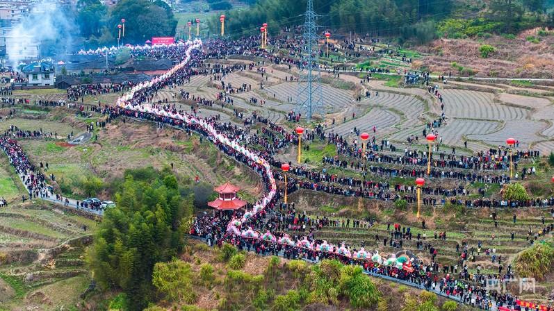 以竹为骨、宣纸为鳞,龙头高逾3米,龙身绵延数百节……元宵节当天,夜幕降临时,在福建省龙岩市连城县姑田镇,神铳轰鸣、锣鼓喧天,数千名的当地中青年村民抬着数百米长的巨龙,在长长的彩旗队、灯箱队的引领下,蜿蜒于乡间村野,穿行于大街小巷,腾挪起伏,活灵活现——这就是闽西客家元宵节庆姑田游大龙活动。这项国家级非物质文化遗产代表性项目县级代表性传承人江修源介绍,这项活动始于明代,至今已有400多年历史,意在祈求风调雨顺、五谷丰登。