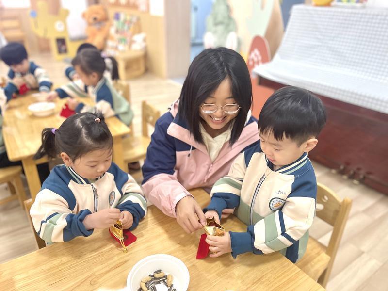 9时10分,托育班里一场音乐游戏——“福气要来到”正在进行。孩子们通过装福袋、摘福袋等活动,感受新学期的欢乐氛围。托育班班主任胥芳芸介绍:“通过这种寓教于乐的方式,不仅能够增强孩子们对音乐的感受力,还能让他们在活动中学会分享与合作。”