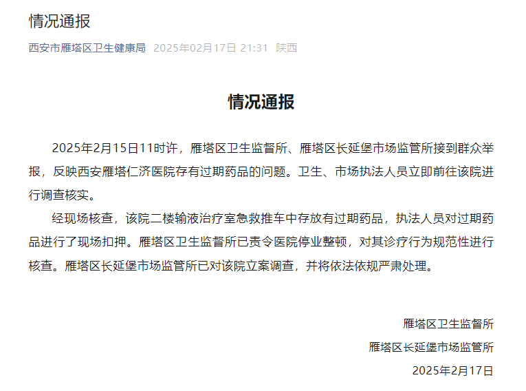 据西安市雁塔区卫生健康局微信公众号消息,2025年2月15日11时许,陕西省西安市雁塔区卫生监督所、雁塔区长延堡市场监管所接到群众举报,反映西安雁塔仁济医院存有过期药品的问题。卫生、市场执法人员立即前往该院进行调查核实。