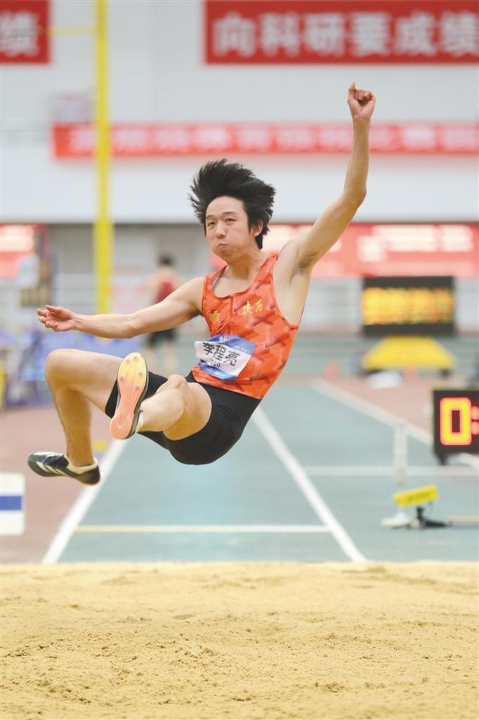2月14日,陕西运动员李程亮参加男子跳远项目比赛。