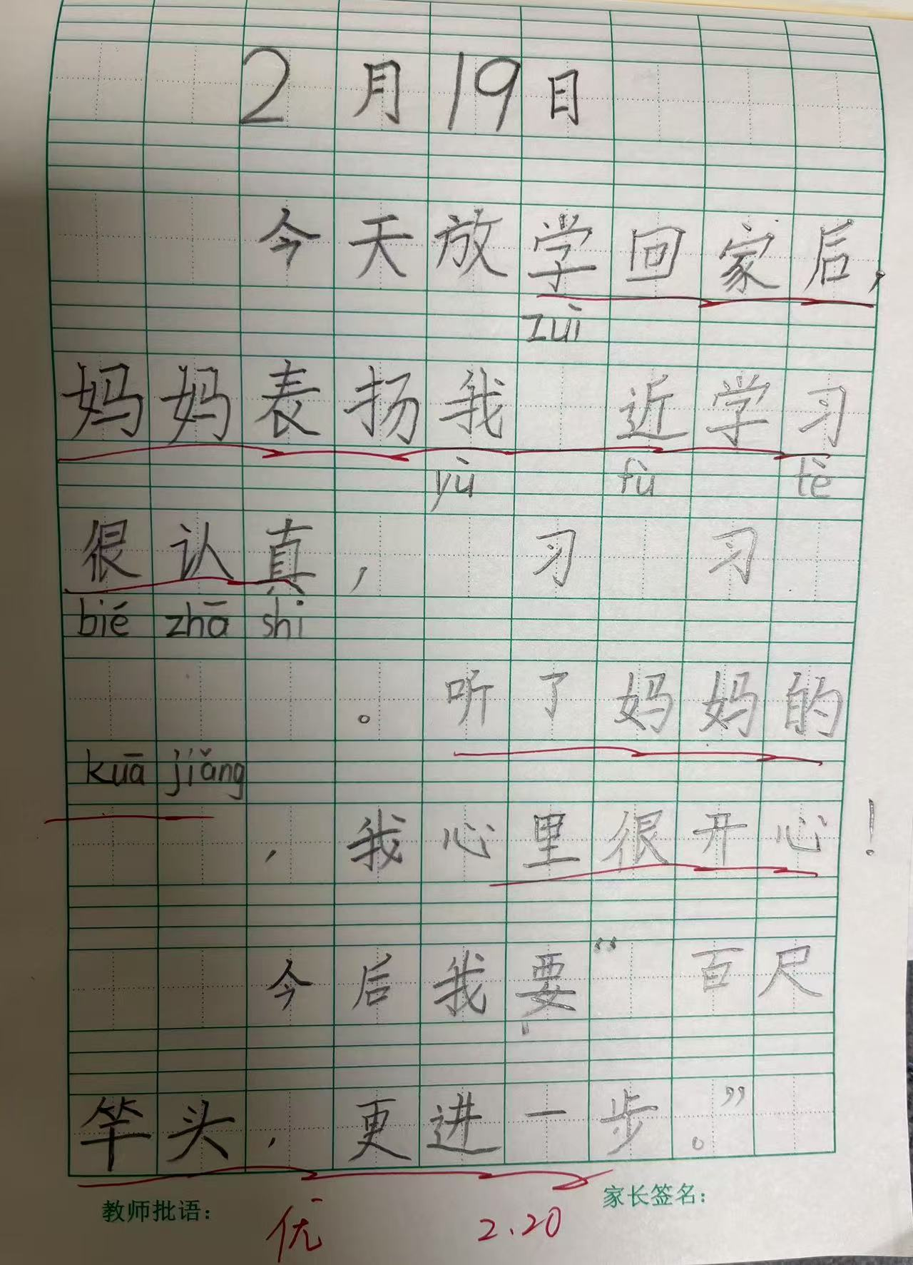 今天放学回家后,妈妈表扬我最近学习很认真,预习复习特别扎实。听了妈妈的夸奖,我心里很开心!