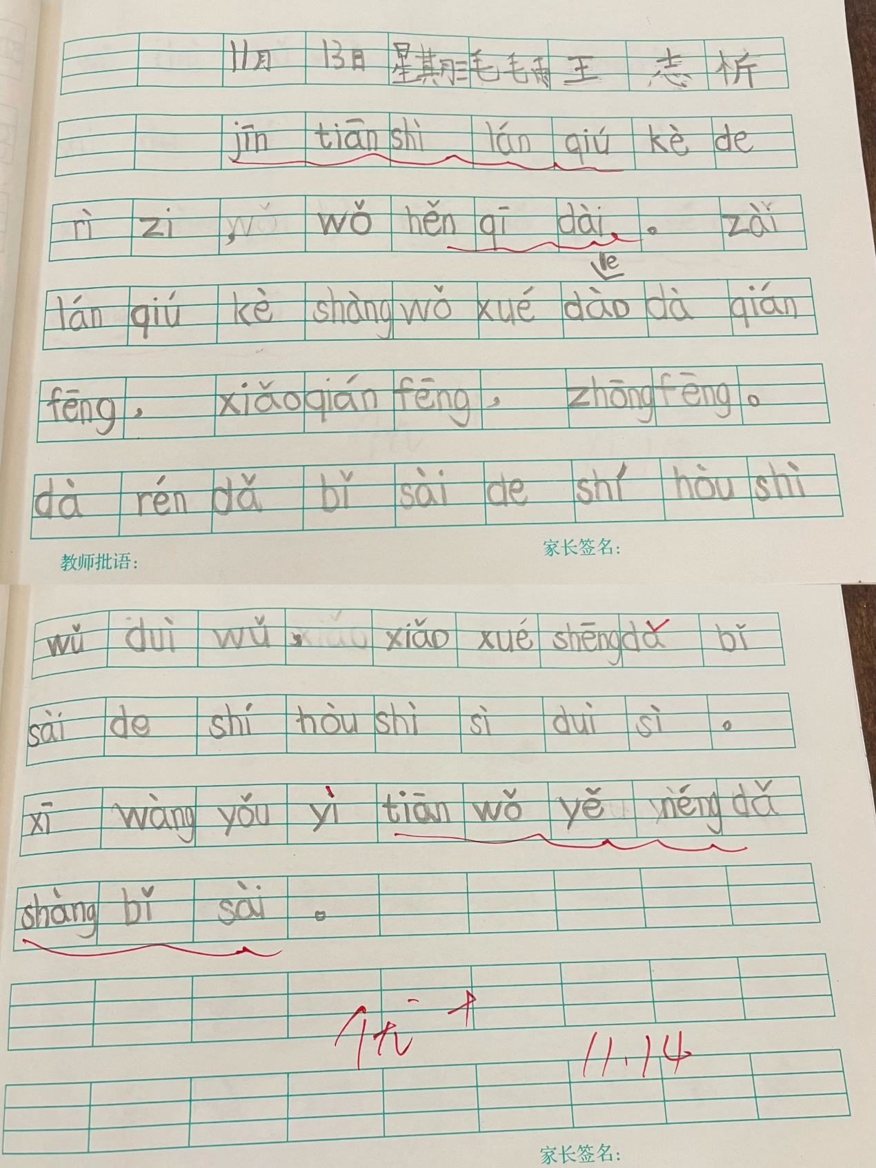 今天是篮球课的日子,我很期待。在篮球课上我学到了大前锋,小前锋,中锋。大人打比赛的时候是五对五,小学生打比赛的时候是四对四,希望有一天我也能打上比赛。