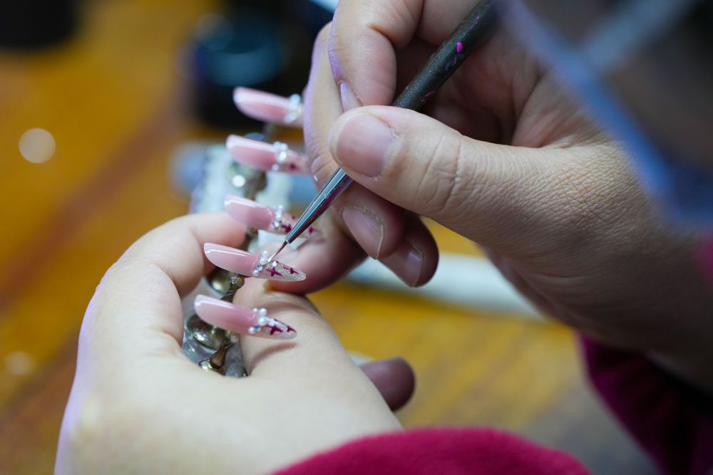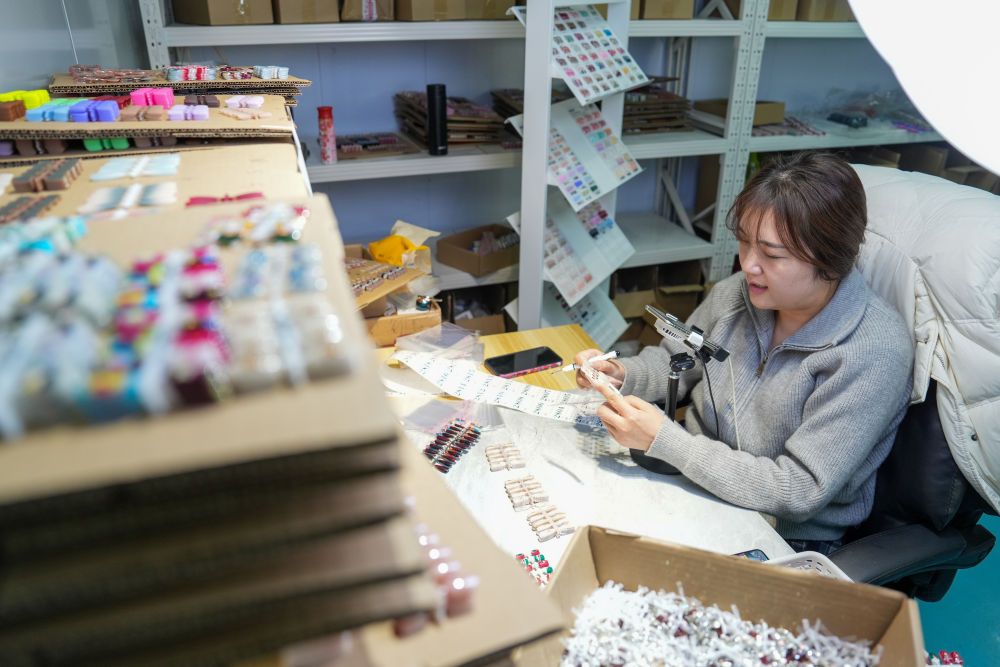 以设计切入,突出手工价值,手工穿戴甲正在创造越来越多的工作岗位。一批设计师通过线上接活,就能获取不菲收入;一批“宝妈”经过培训,在家就可以生产,每天能挣三五百元,带娃、挣钱两不误。