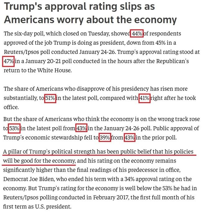 路透社在报道中指出,特朗普政治实力的一个支柱就是不少人相信他的政策对经济有利,而最新民调结果显示,越来越多的美国人因为这位新总统威胁要对外加征关税而对美国的经济发展方向感到担忧。
