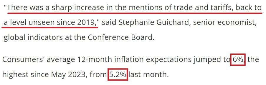 在美国CCI以三年半以来的最大速度恶化的同时,美国消费者对未来一年的通胀预期也从5.2%大幅升高至6%,达到2023年5月以来的最高水平。这进一步显示,美国人对特朗普政府政策可能对经济造成的负面影响越来越担忧。