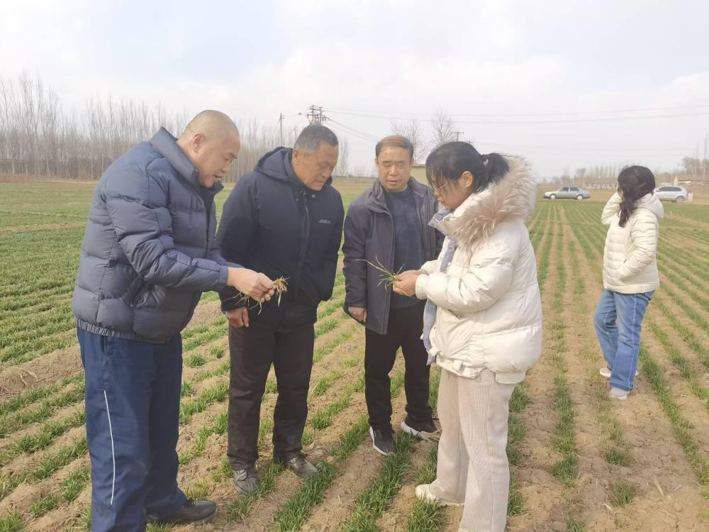 山东省夏津县农业农村局植物保护站站长、高级农艺师郑曰英(右二)在开展小麦苗情调查、病虫害监测,并指导粮农加强春季田管。(受访者供图)
