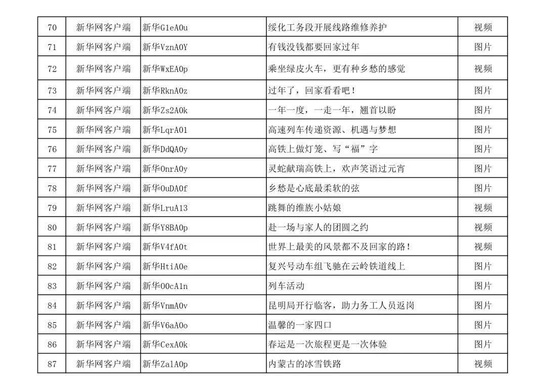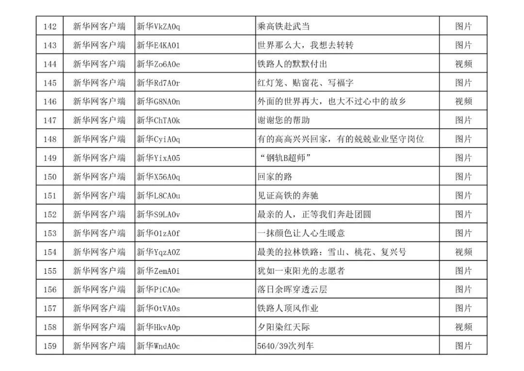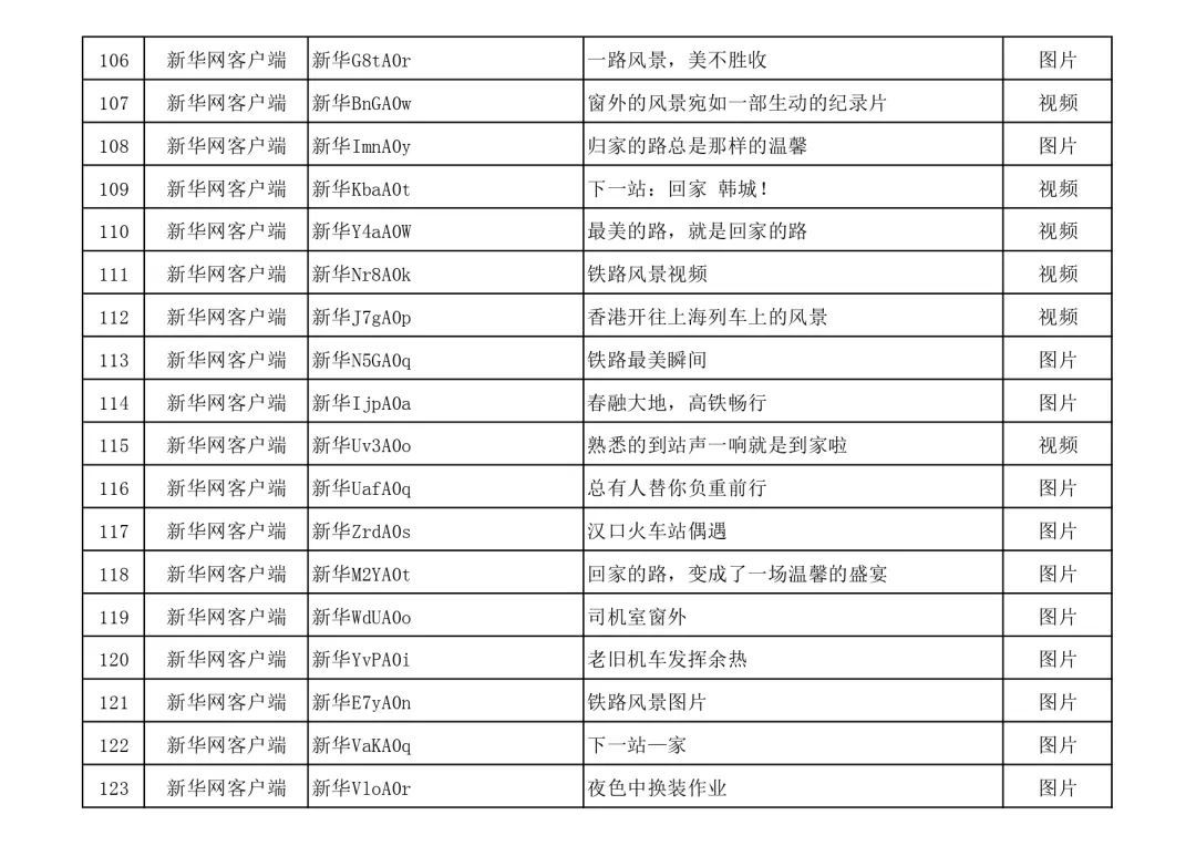 3月13日,由中宣部文明创建局、中央网信办网络传播局、中国国家铁路集团有限公司党组宣传部联合举办的“我的铁路风景”主题宣传首季活动优秀作品,在人民日报客户端、新华网、中国文明网、人民铁道网、中国国家铁路集团有限公司官方网站等平台公布,共410件,其中图片245个(组)、短视频131个、短文34篇。