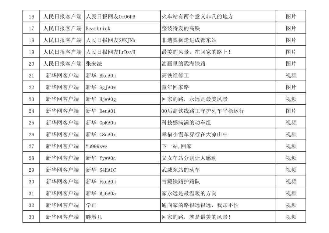 近日,活动承办单位人民日报客户端、新华网客户端、微博、抖音、小红书和中国铁路新媒体平台,对首季活动遴选展示的作品进行了评审,最终形成410件优秀作品。