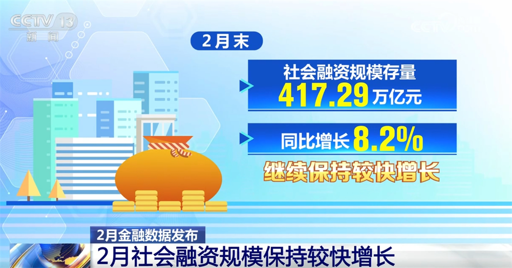 2月末社会融资规模存量为417.29万亿元,同比增长8.2%,继续保持较快增长。专家表示,政府债券加速发行是支撑社会融资规模较快增长的主要因素。