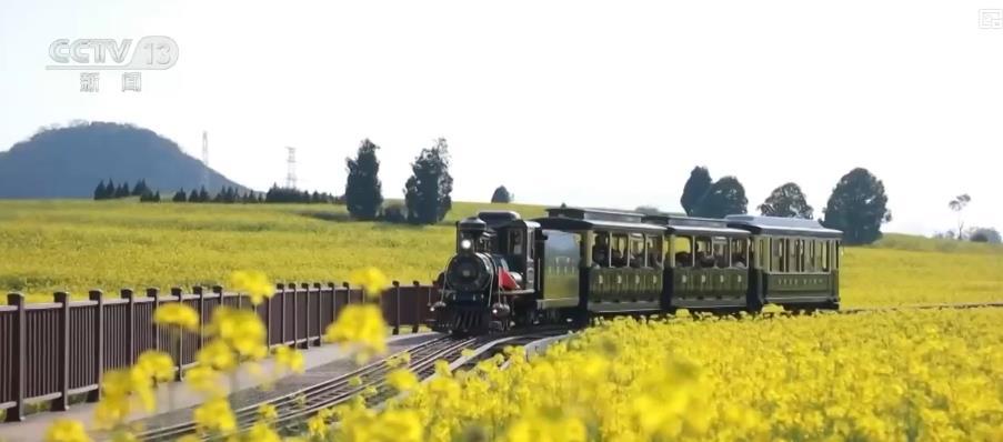 在罗平县,万亩油菜花田像一块块金色的绒毯在地面铺开。群山、村落相互映衬,列车从田边驶过,一幅春意盎然的乡村画卷映入眼帘。游客们从各地赶来,领略油菜花的美丽。