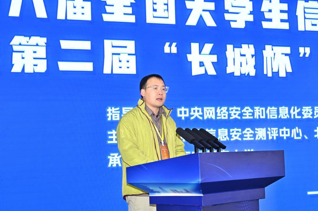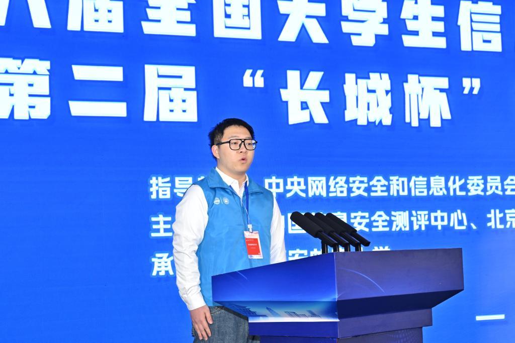 大赛裁判长、中国信息安全测评中心谢旭辉宣读了比赛规则。西安邮电大学网络空间安全学院2023级本科生李建雄作为参赛选手代表发言。