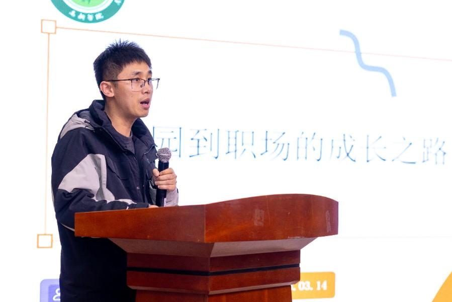 优秀校友曹剑以亲身经历为高新学子带来了一场充满力量的分享。他手握四项发明专利、六篇学术论文,参与“1600W通信二次电源模块开发”、“4300W通信一次电源模块开发”等多个重点项目,展现了卓越的科研能力与工程实践精神。分享中,他展示了自己本科时期的生活照片,并由衷感恩于母校对自己的栽培。他坦言,考研不仅改变了自己的人生轨迹,更让他遇见了研究生导师刘树林教授,正是刘教授为他“打开了认识世界的大门”。他鼓励学弟学妹要珍惜大学时光,勇敢尝试新事物,多多历练,在攀登人生巅峰的道路上永不言弃!
