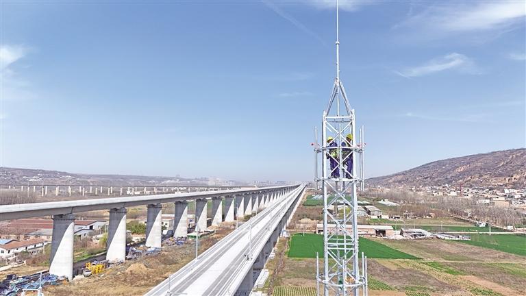 3月18日,由西成客专陕西公司建设、中铁一局电务公司承建的西十高铁全线首座通信铁塔完成组立,标志着全线通信网络建设进入施工新阶段。据了解,西十高铁全线共设计通信铁塔11座。此次组立的首座铁塔高约35米,塔身重约8.5吨,采用单元组合及模块化方式搭建,能有效防范各种风力环境、满足多型天线荷载。图为施工作业人员在安装风速测试仪及相关塔材附件。 记者 杨光摄