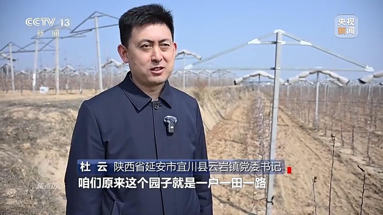 陕西省延安市宜川县云岩镇党委书记 杜云:“原来这个园子是一户一田一路,家家都要有生产路,原来有108块,小田并大田以后并成了24块,地界少了土地就多出来了,涨了95亩地。小田并大田以后以株代亩,土地不是按亩分,是按株分,一亩地能栽110株。如果你有一亩地就给你分110株,两亩地分220株。”